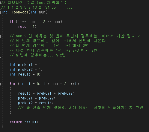 그다음에는 새로운 변수들을 추가 선언해준다. for 반복문을 통해 num-2번 동안 반복하면서 원하는 값을 구해 result에 대입하여 return 할 수 있도록 해주었다.