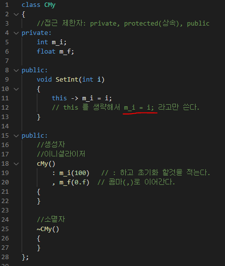 컴파일러 단계에서 설계되어 있어서 기본적으로 this를 생략해서 사용한다. (m_i = i;)