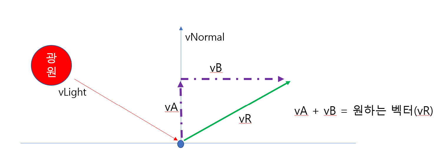 우리는 vA + vB를 구해서 vR을 구하고자 했다. 하지만 vLight 벡터를 더 길게 늘여서 아래로 내린다면